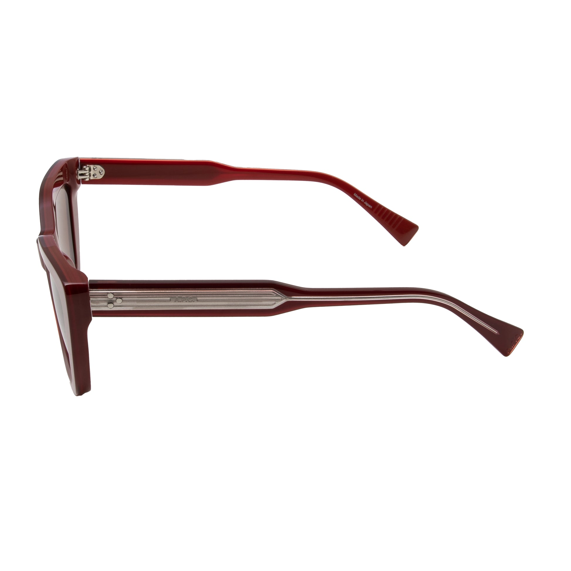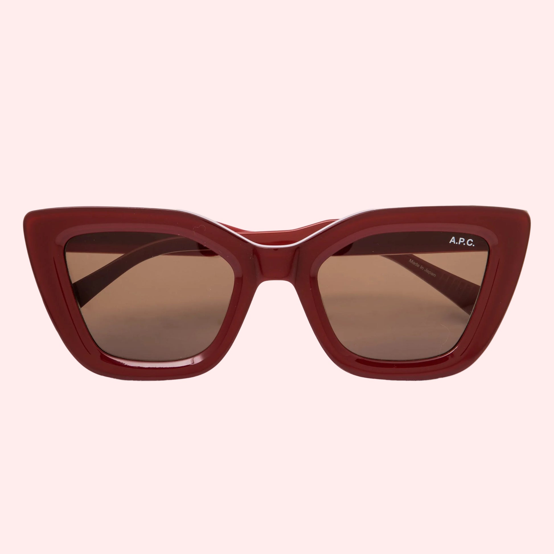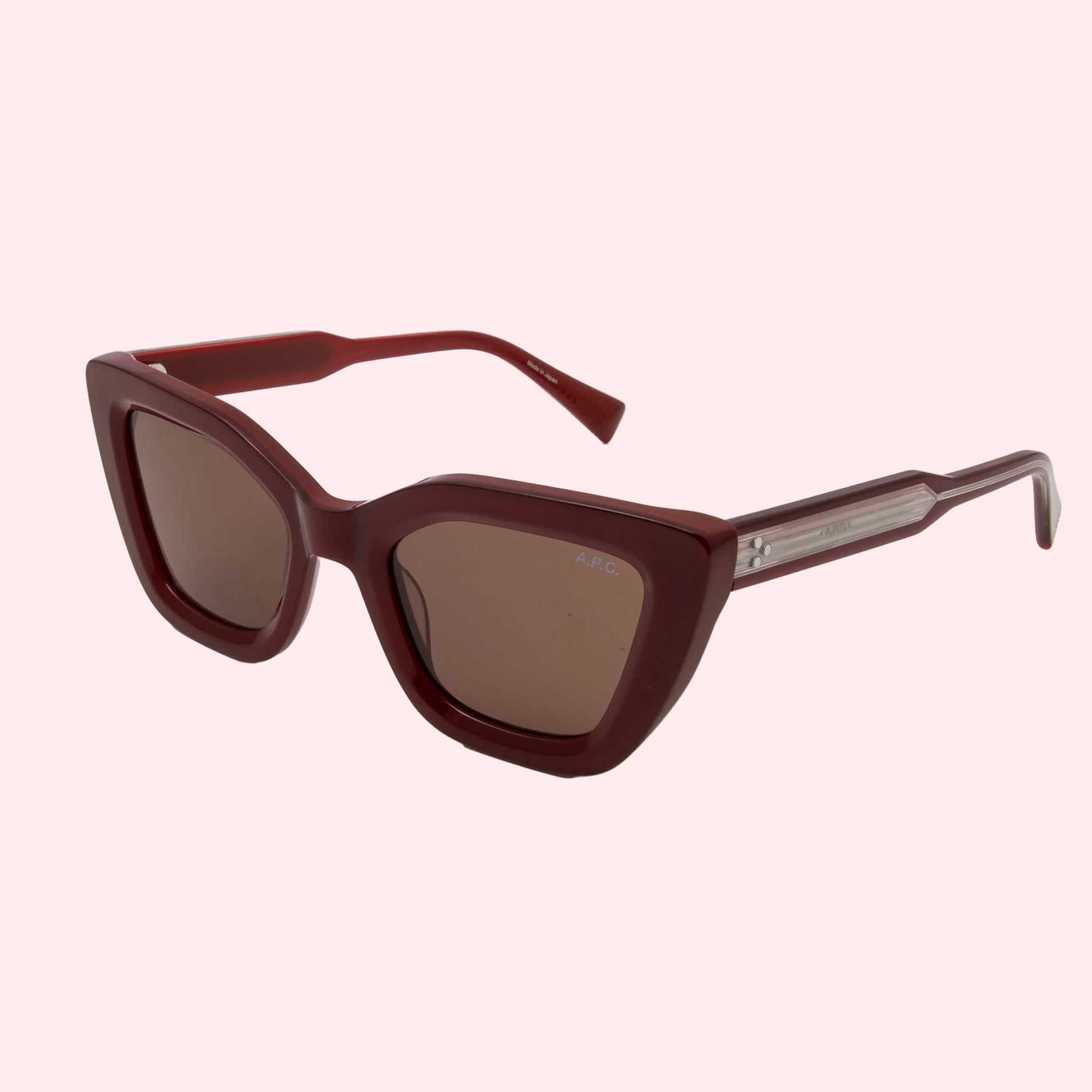 Butterfly shaped sunglasses in a wonderfull burgundy cherry colour with brown lenses, made from ACETATE AND METAL