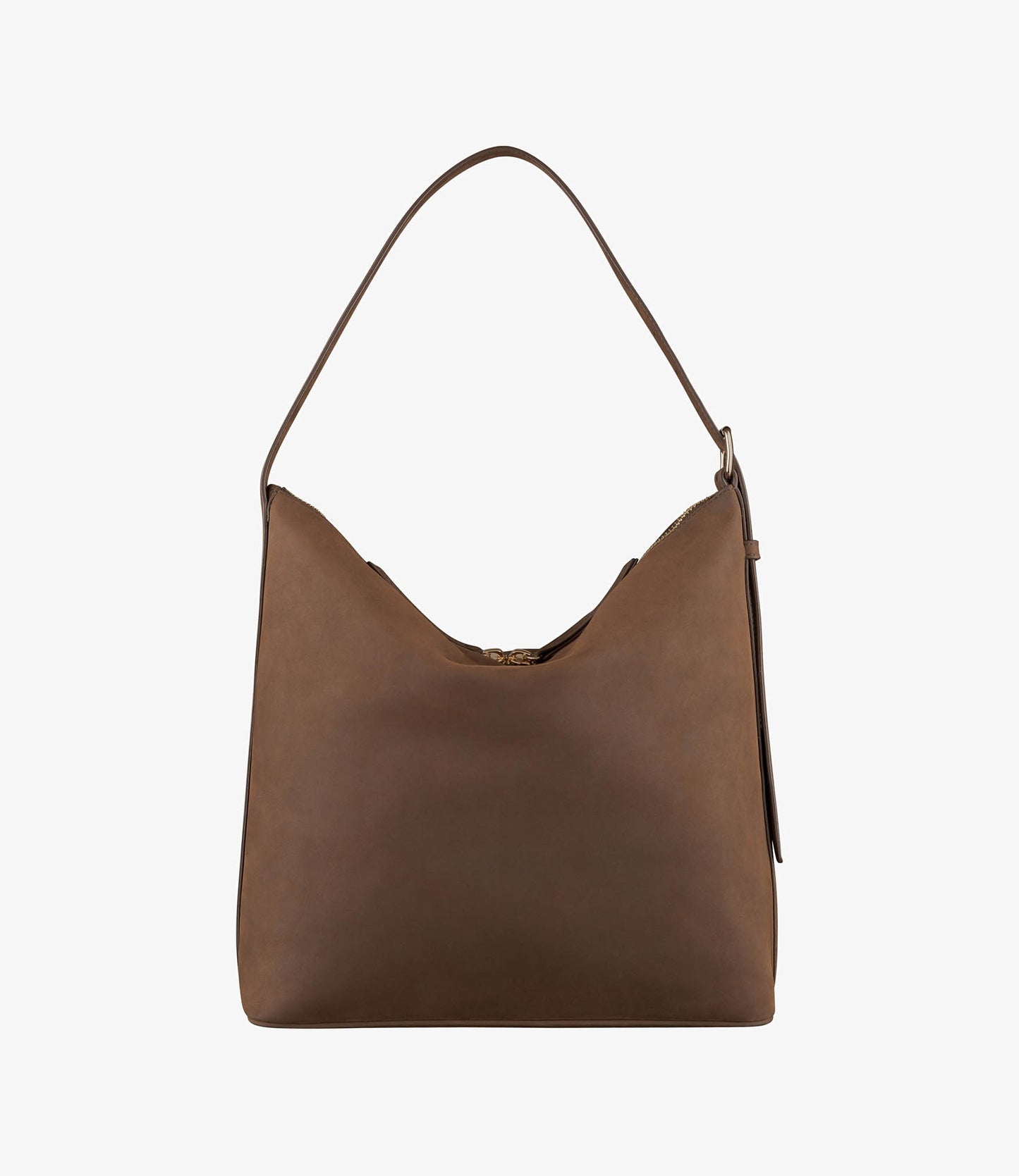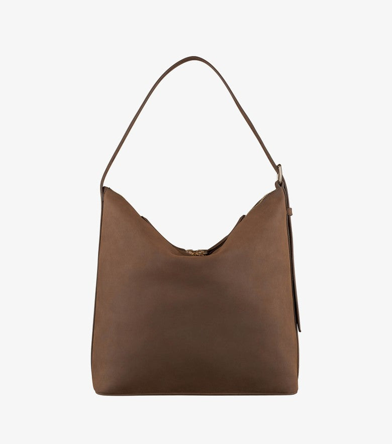 - One large shoulder strap adjusts with a goldtone metal buckle to carry the bag on the shoulder or by hand