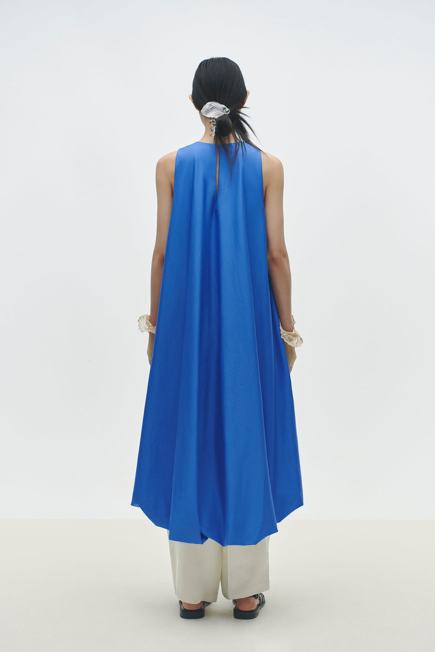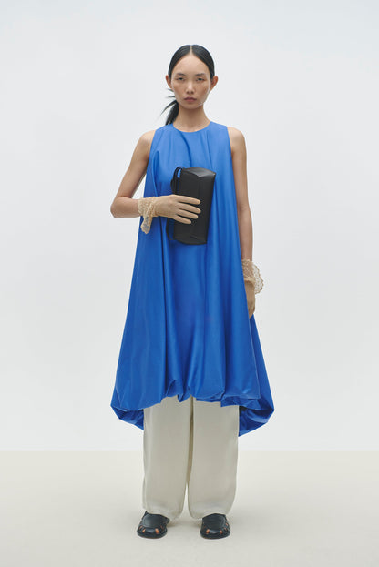 This dress features a dramatic balloon fit with an asymmetrical design, longer at the back for an elegant flow. It has a teardrop button closure at the back, a round neckline, and practical side pockets. The dress boasts substantial volume and movement, creating a fluid and graceful silhouette. It is fully lined in a matching tone for a seamless finish.