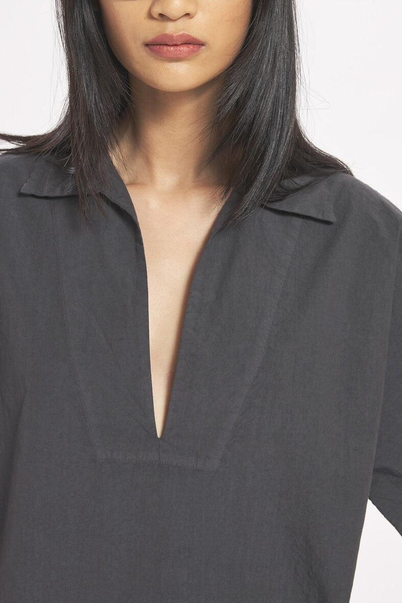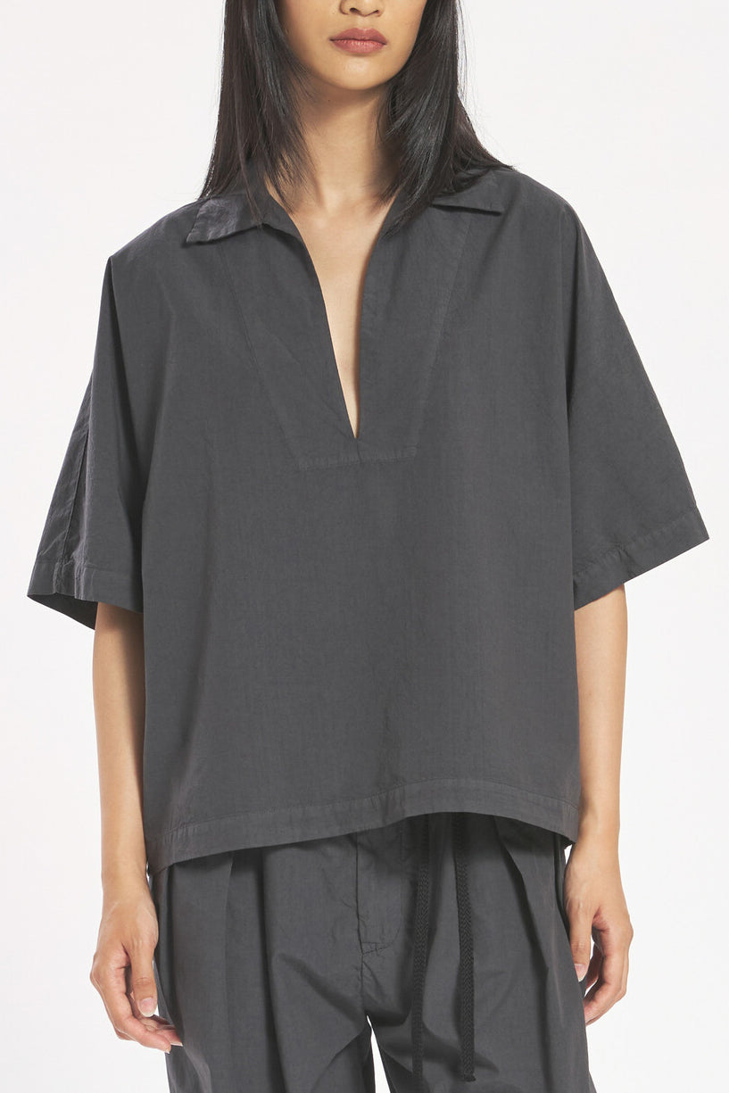 Loose fit, relaxed top in a taupe infused grey colored 100% Cotton with short sleeves and a v-neck