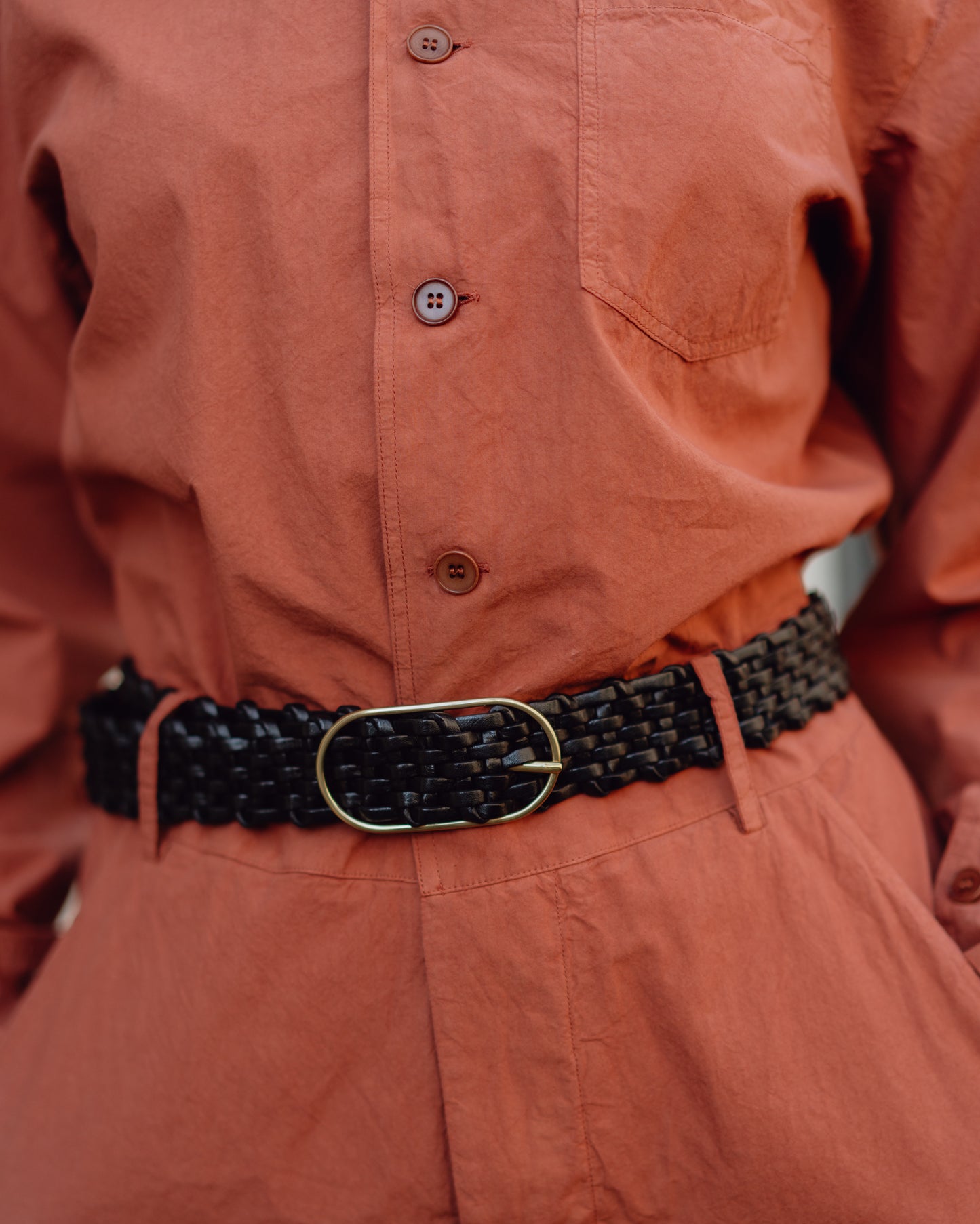 This braided belt is defined by a minimalist elegance. Embellished with a brass buckle, this interwoven black leather belt is perfect to enrich day and evening looks.