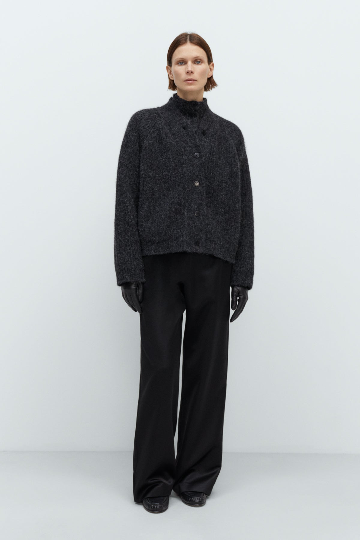 Lightweight, boxy oversized fit with side slits for added comfort. Front horn button closure and a V-shaped high collar. In a warm anthracite mélange, the mélange effect adds texture, enhancing the cardigan's unique style and warmth.