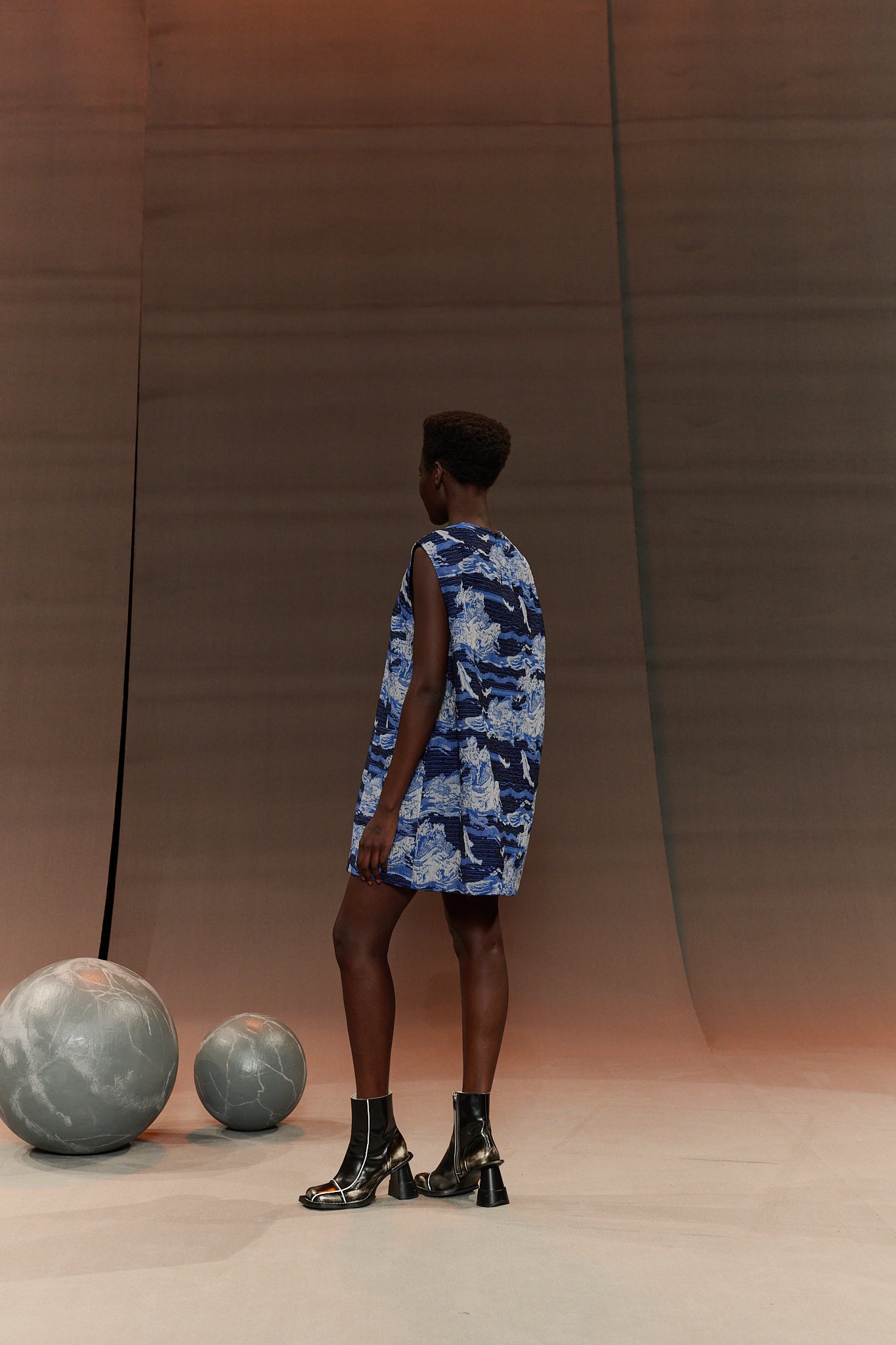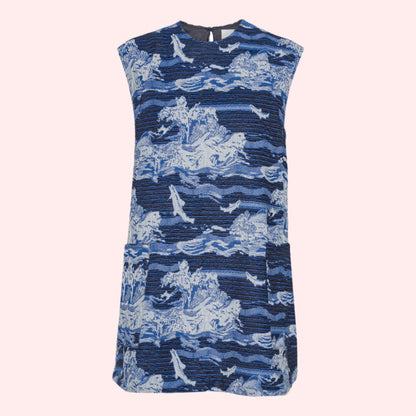 What makes this dress oh so very special is its' signature fabric: This fabric is made in France by Dutel Création, specialist jacquard weavers dating back to 1937. It is specially developed with a Henrik Vibskov artwork, showcasing fishermen catching fish in a mountain creek.