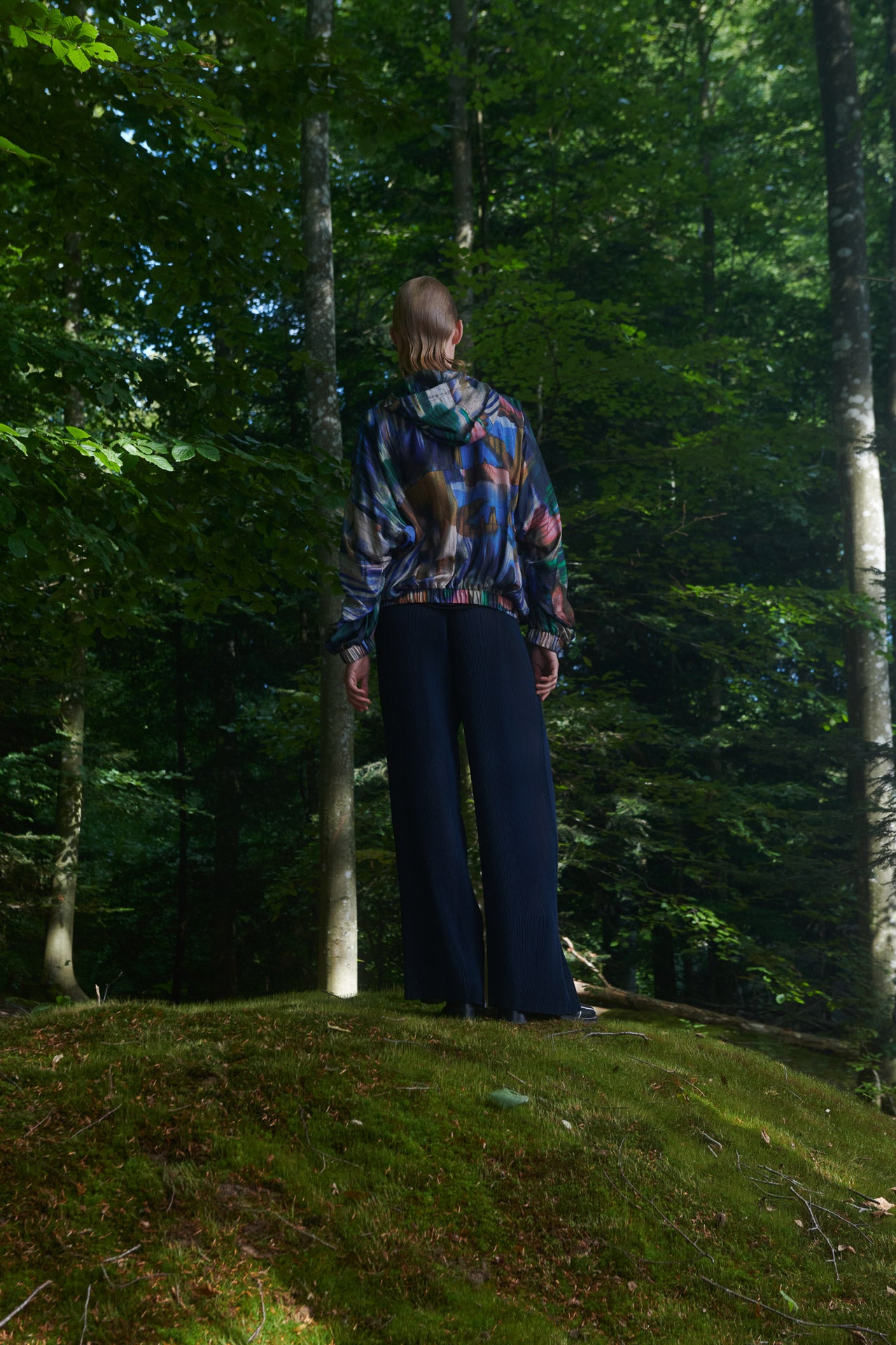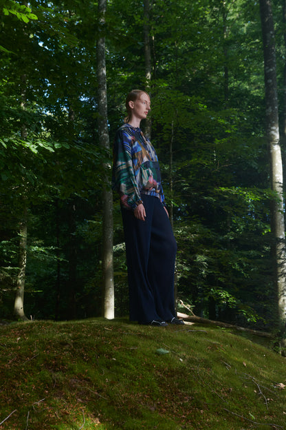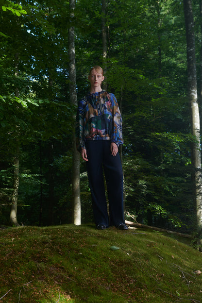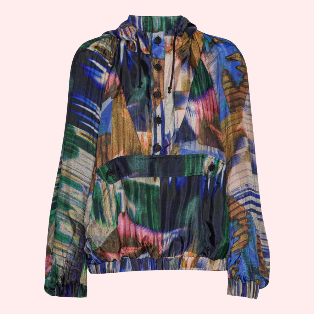 A super fluid anorak top, wear it as a blouse, an overshirt, or a thin sweater. With beautiful colors in a typical Henrik Vibskov print.