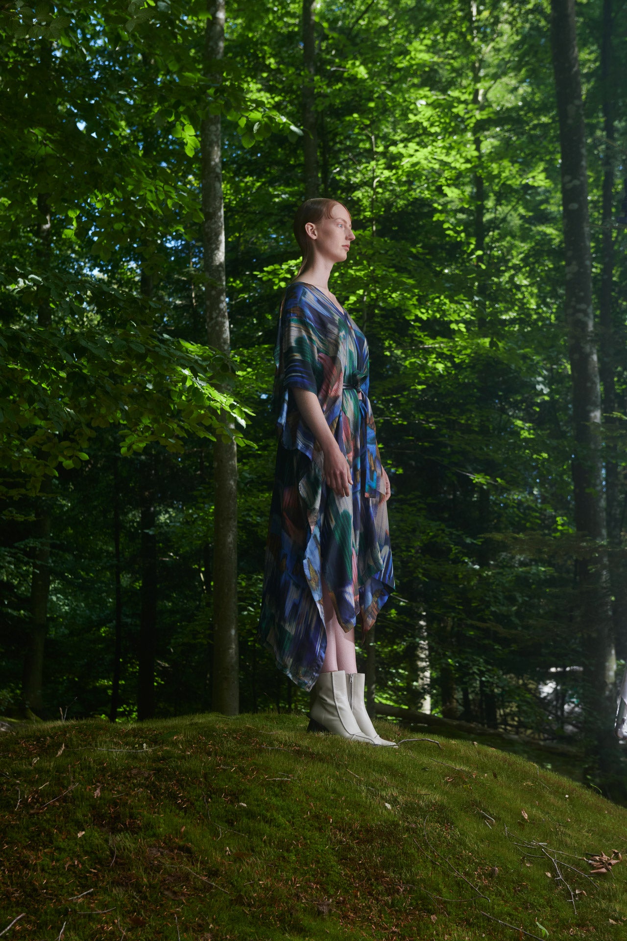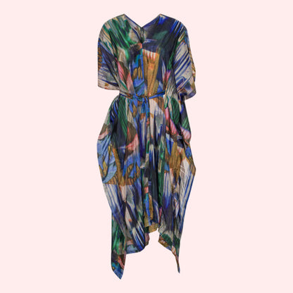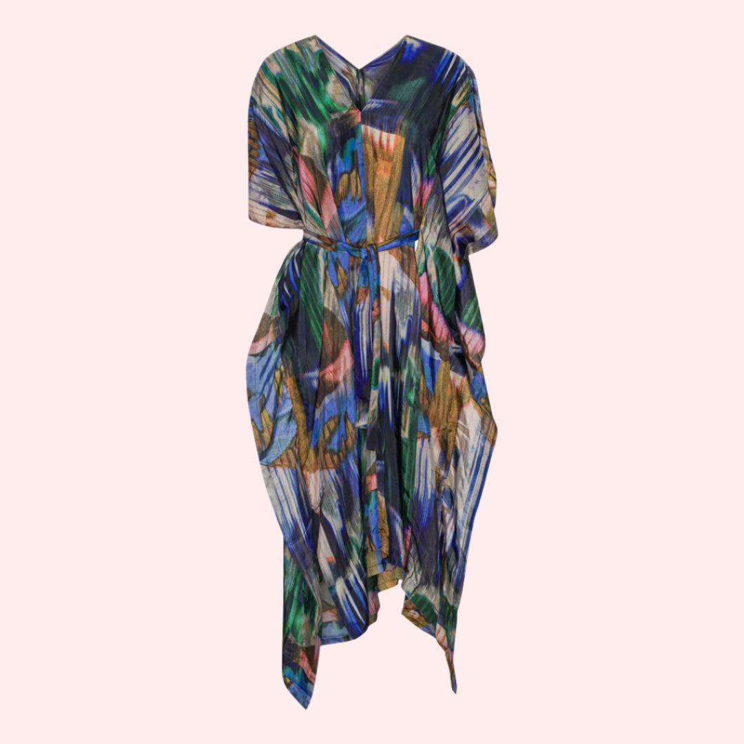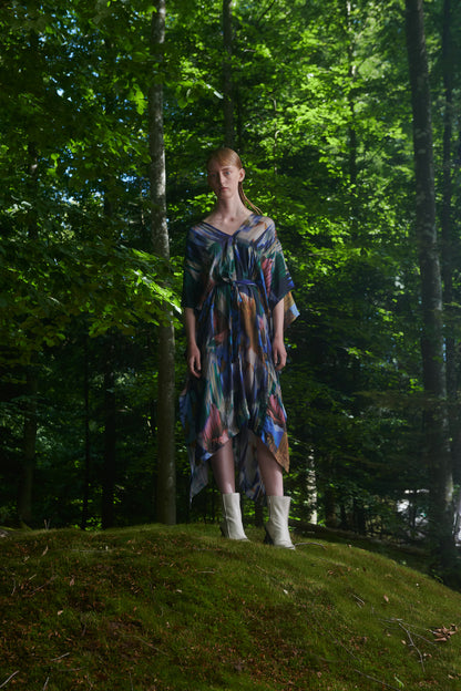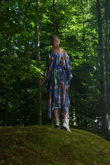 A super fluid summer dress in Kaftan style. Wear it as a kaftan, semy-kaftan, of with the accompanying ribbon tied completely around the waste. It is not called uncut for nothing ;) With beautiful colors in a typical Henrik Vibskov print.