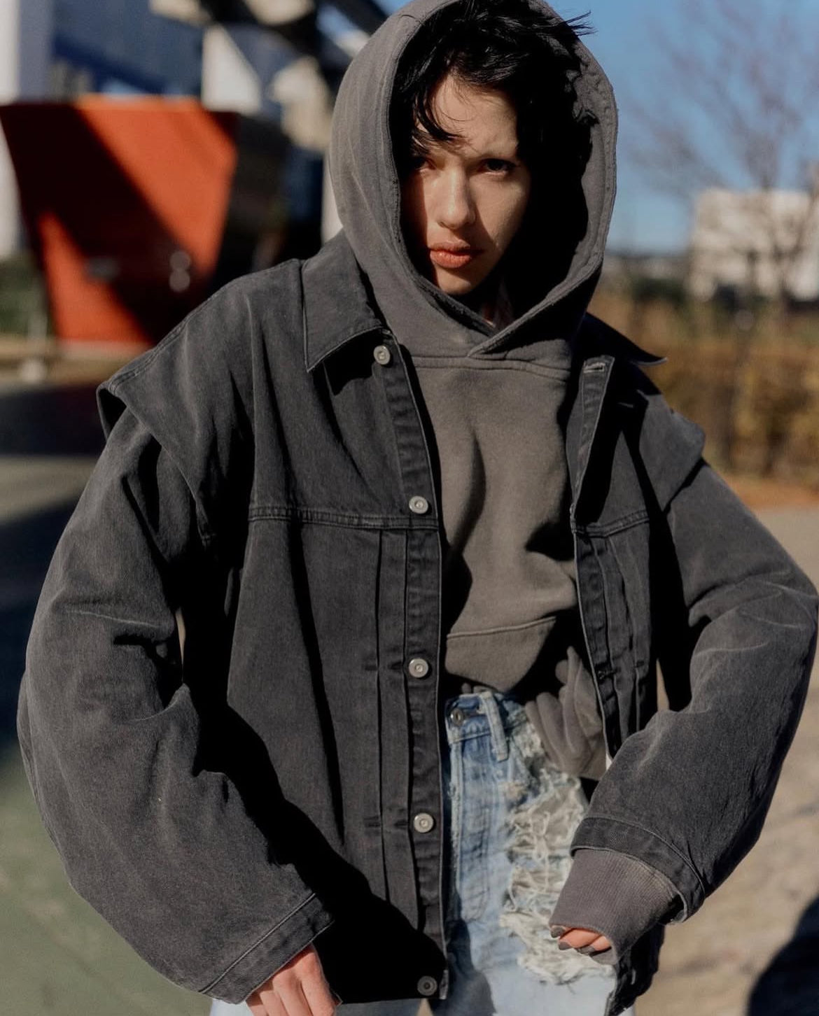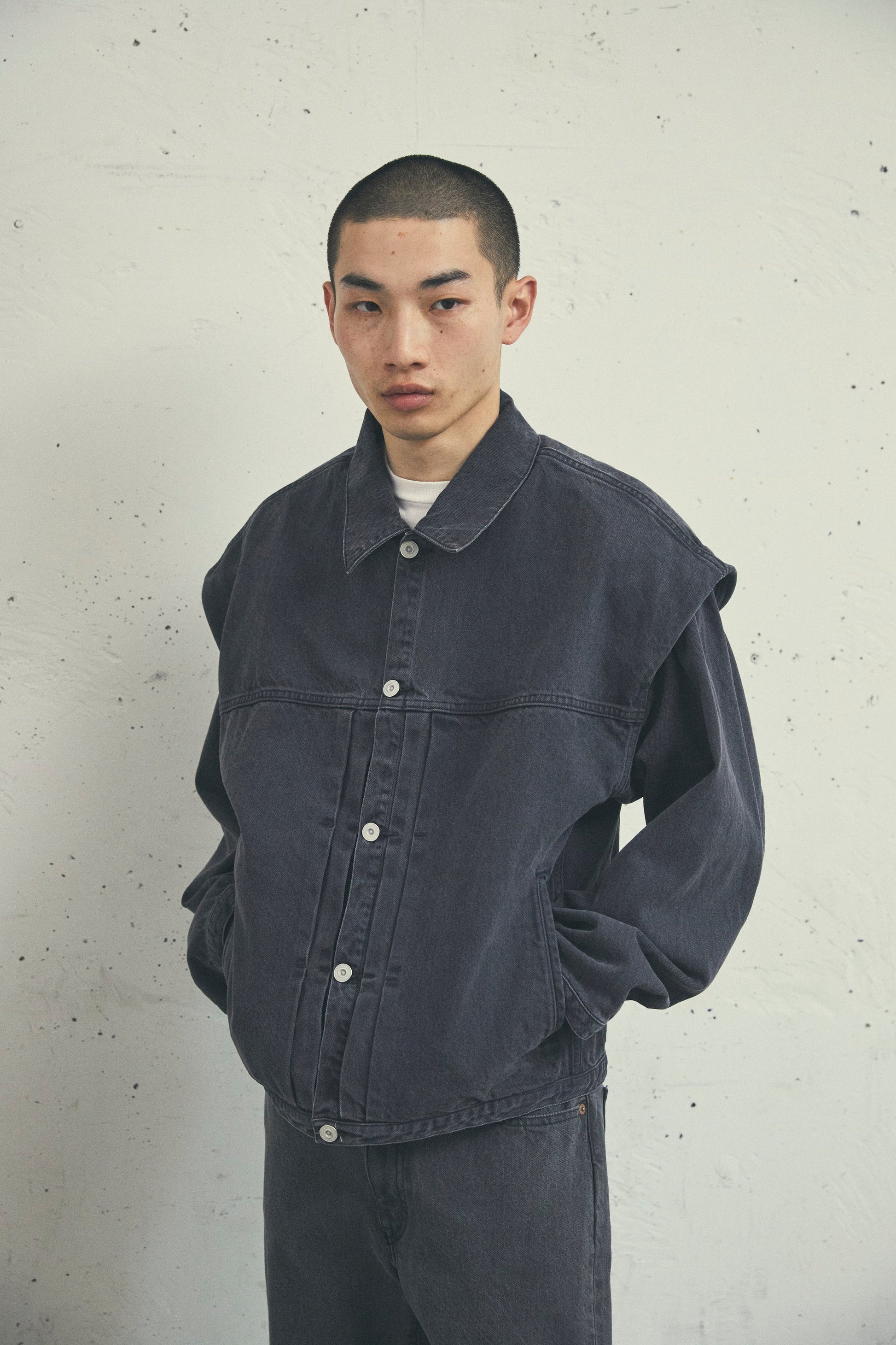 Shoulder pads are a concept created by independent women who cannot fit into the existing framework of society. This denim jacket looks like it has built-in shoulder pads. The shoulder pads are not actually used, but are created by KURO's unique detailed specifications.