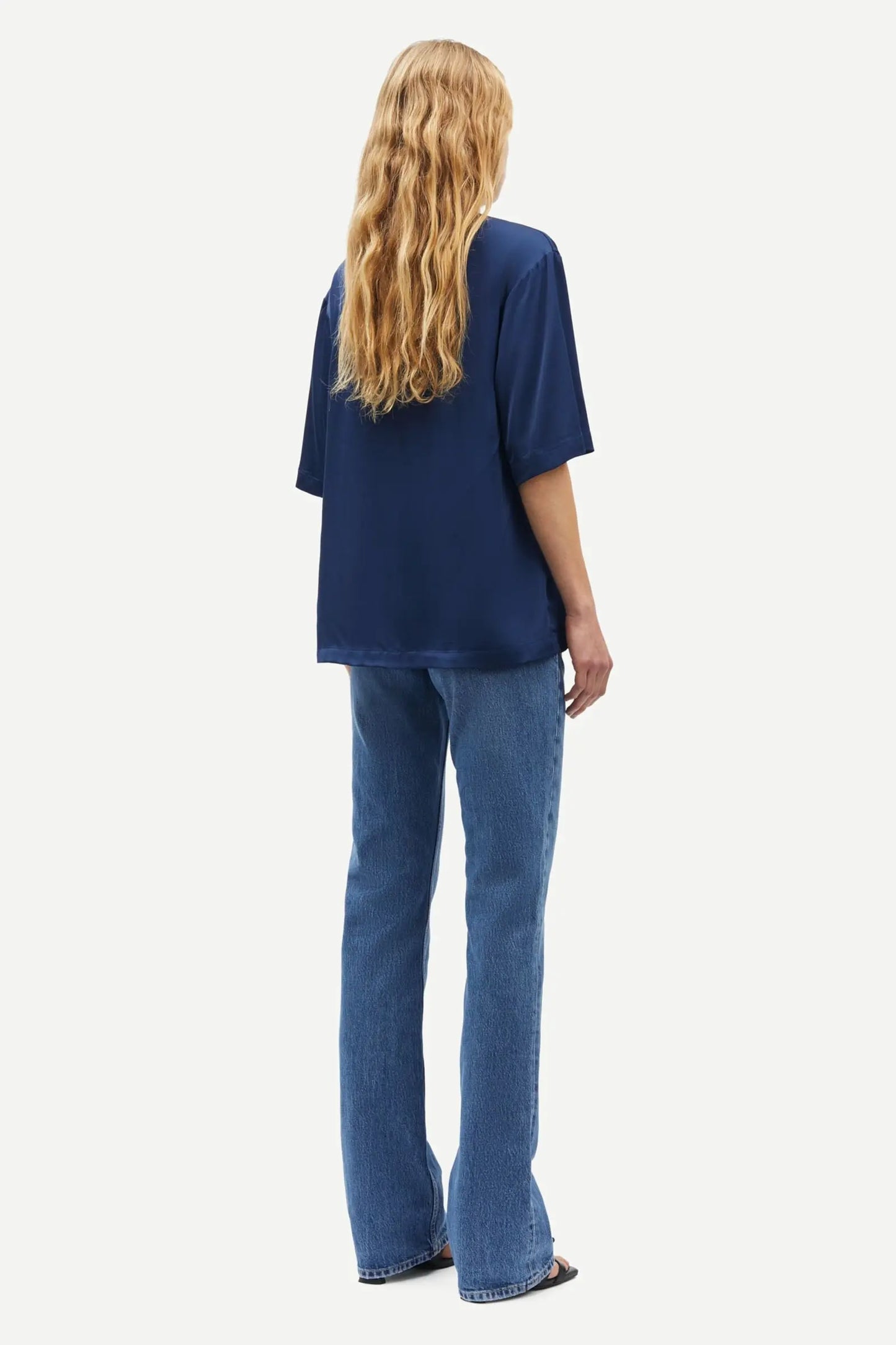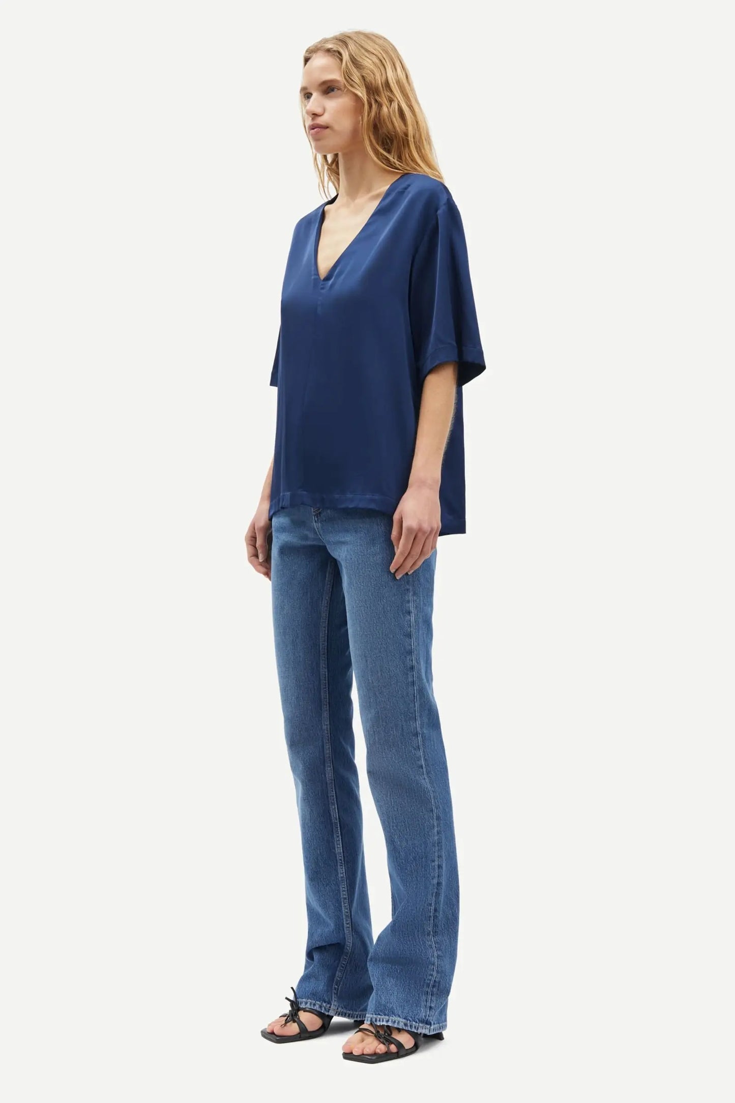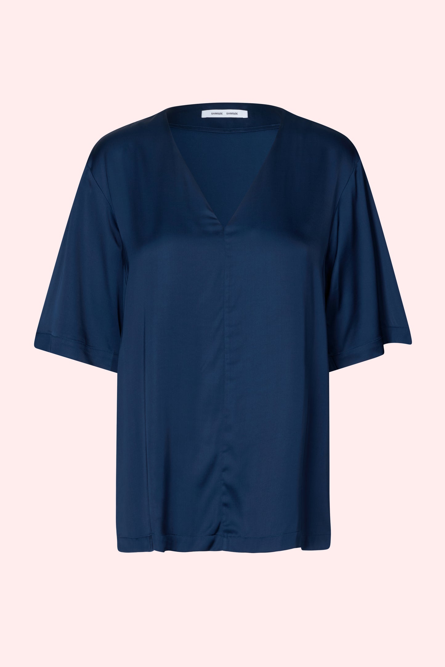 Short-sleeved satin top with a loose fit. V-neck. Main material made from a blend with LENZING™ ECOVERO™ Viscose. This product contains LENZING™ ECOVERO™ Viscose, certified with the EU Ecolabel for meeting high environmental standards.